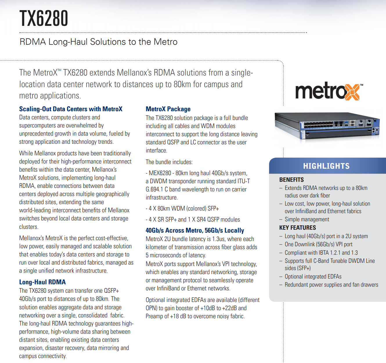 MetroX TX6280 将 RDMA 解决方案从单一位置数据中心网络扩展到校园和地铁应用的 80 公里距离。
